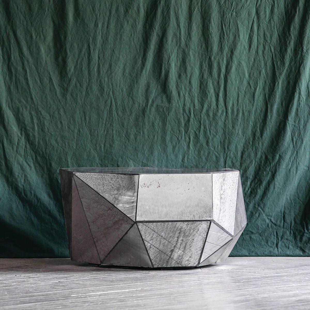Our ultra-mod Reflections coffee table is assembled with hand-cut, spotted glass in a geometric shape.